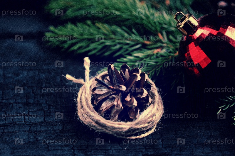 Рождественская открытка - еловая шишка и новогодняя игрушка