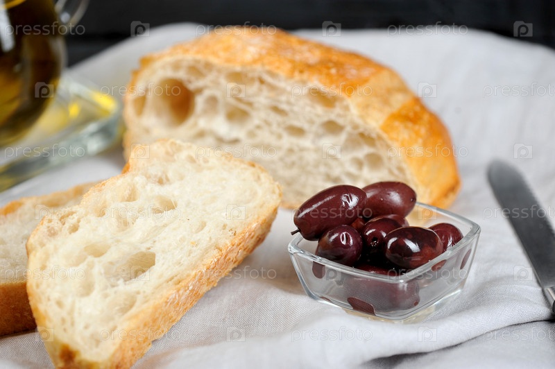 Оливки, оливковое масло и чиабатта