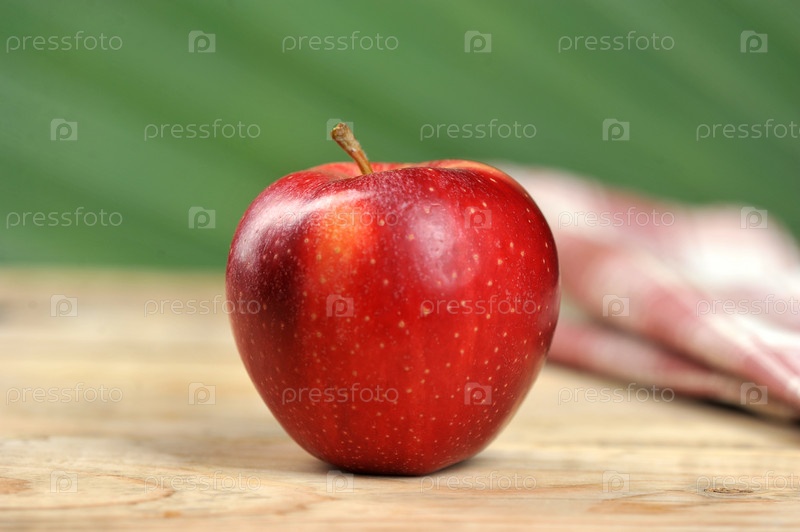 Красное сочное яблоко на деревянном фоне