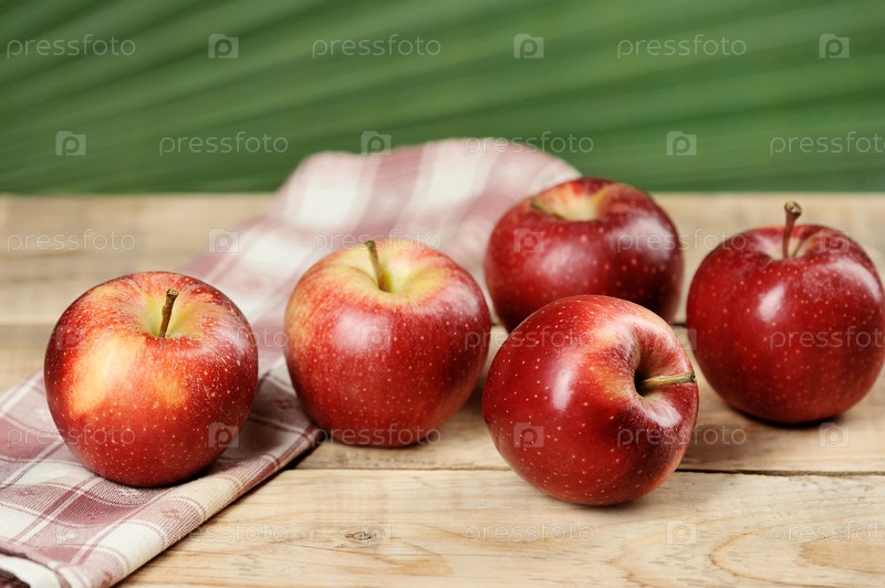 Красные сочные яблоки на деревянном фоне