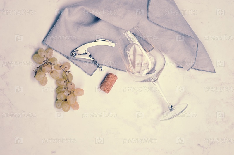 Виноград, штопор, винная пробка и бокал с белым вином