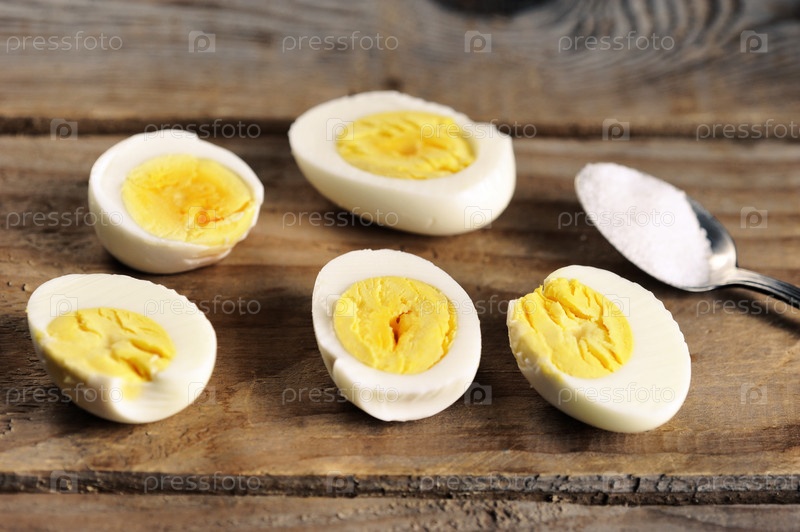 Вареные яйца с солью на деревянном деревенском