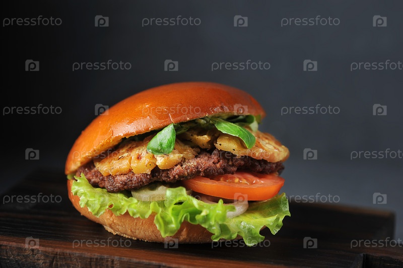 Гамбургер с котлетой, помидором и ананасом