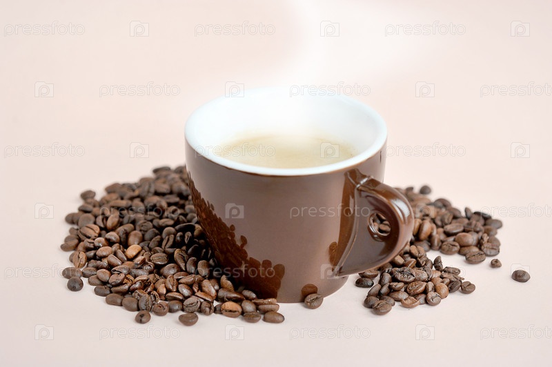 Коричневая кофейная чашка и кофейные зерна