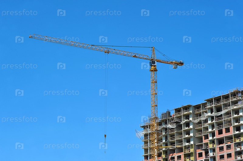 Строительство современного кирпично-монолитного дома и строительный кран в Санкт-Петербурге