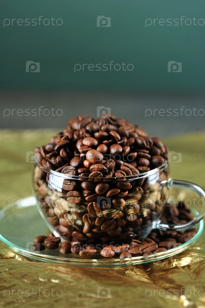 Кофейные зерна в прозрачной стеклянной чашке на золоте
