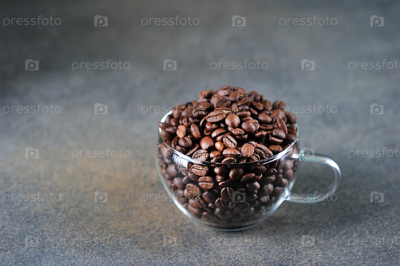 Кофейные зерна в прозрачной стеклянной чашке на сером