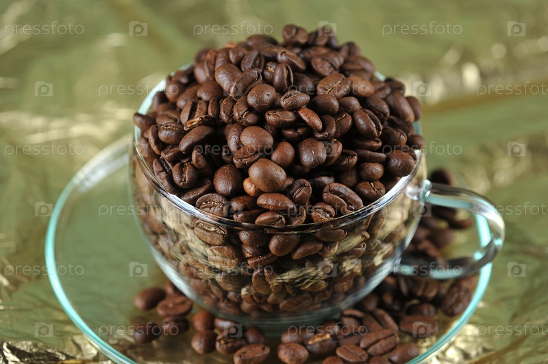 Кофейные зерна в прозрачной стеклянной чашке на золоте