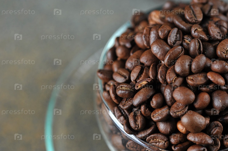 Кофейные зерна в прозрачной стеклянной чашке в качестве фона