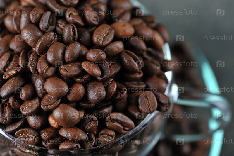 Кофейные зерна в прозрачной стеклянной чашке в качестве фона