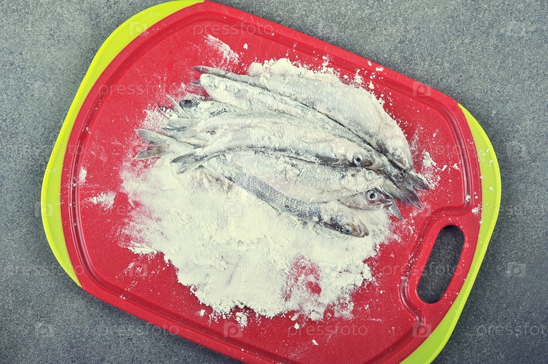 Корюшка, обваленная в муке и готовая к жарке на красной доске