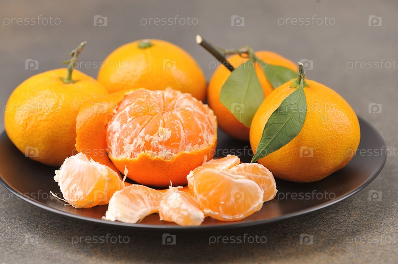 Группа мандаринов-целый мандарин с листьями и очищенный мандарин