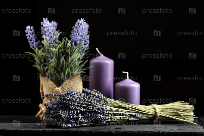Букетик лаванды, перевязанный шпагатом и ароматными сиреневыми свечами