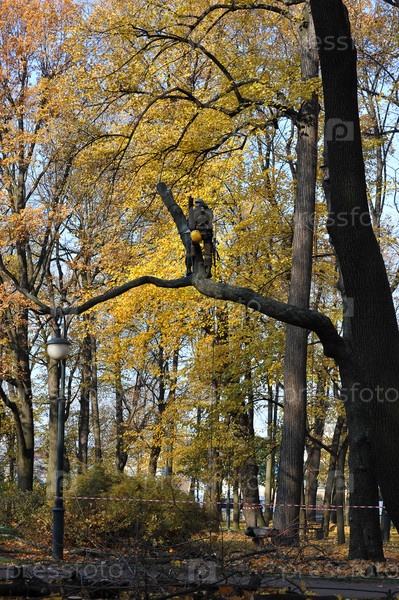 Рабочий с бензопилой рубит дерево
