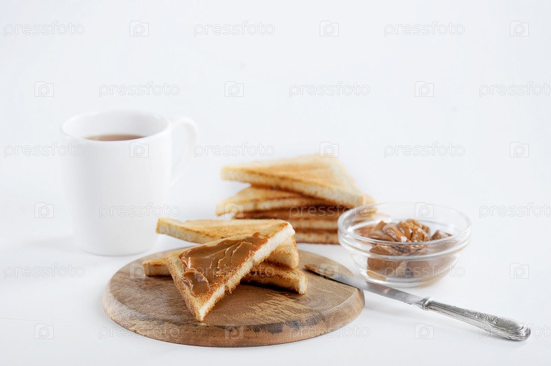 Крупный план вкусного завтрака тостов с джемом из сгущенного молока
