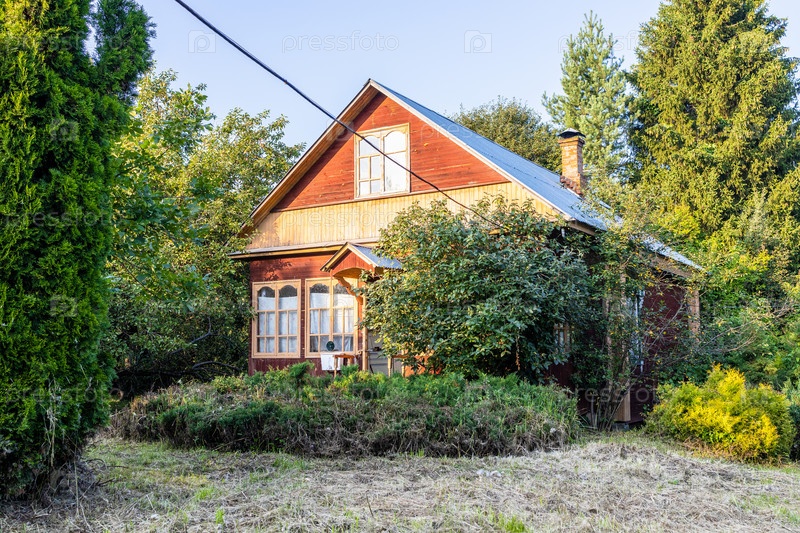 Вид на деревенский дом и куст можжевельника во дворе
