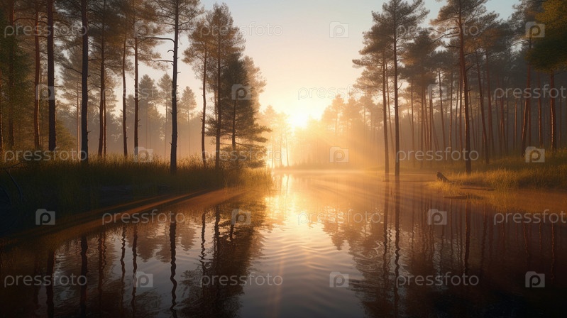 Красочная иллюстрация с пейзажем лесного озера