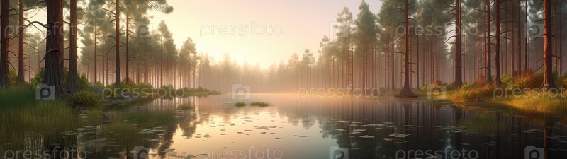 Красочная иллюстрация с пейзажем лесного озера