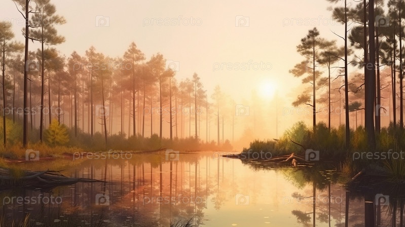 Красочная иллюстрация с пейзажем лесного озера