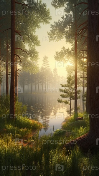 Красочная иллюстрация с пейзажем лесного озера