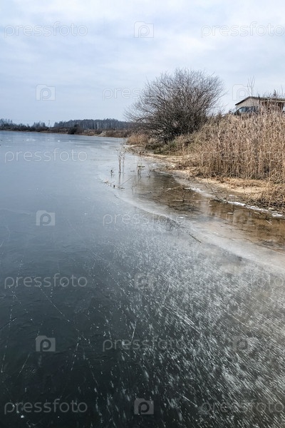 Зимний пейзаж с рисунком ледяных пузырьков воздуха на поверхности замерзшего озера