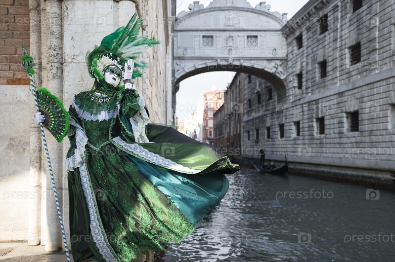 Женщина в зеленом карнавальном платье и маске позирует на фоне моста Понте деи Соспири. Тема венецианского карнавала