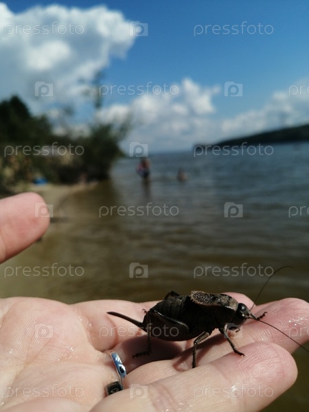 Севчук Лаксмана -впечатляющий кузнечик на ладони сидит в окружении реки Усы и Жигулевских гор