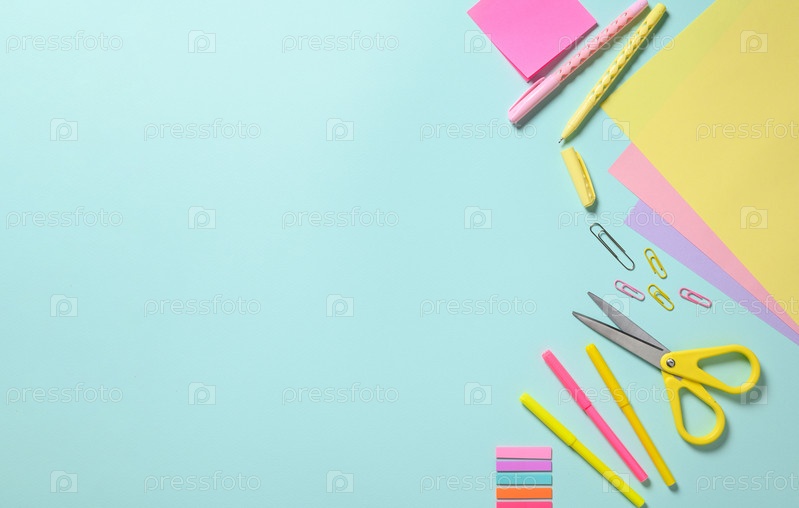 Различные канцелярские товары для творчества на синем фоне. Вид сверху,