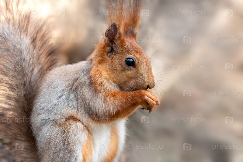 Белка держит орех в лапах и ест его крупным планом