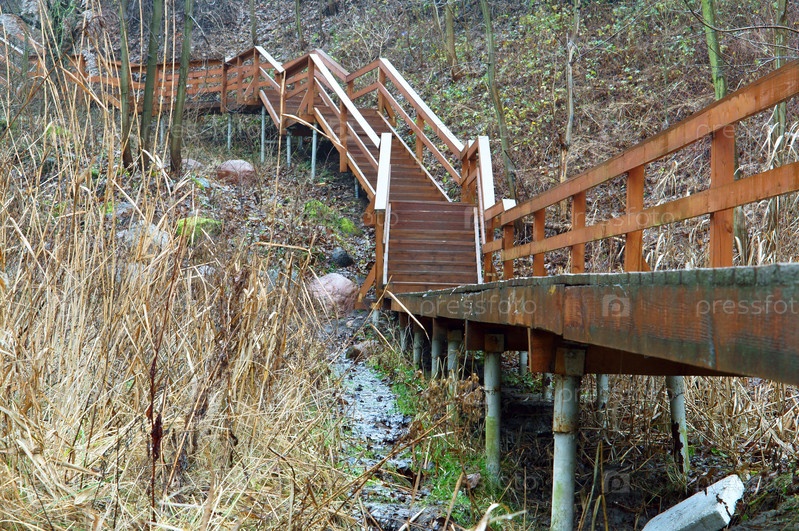 Лестница из дерева ведет к пруду. Деревянная лестница на улицу
