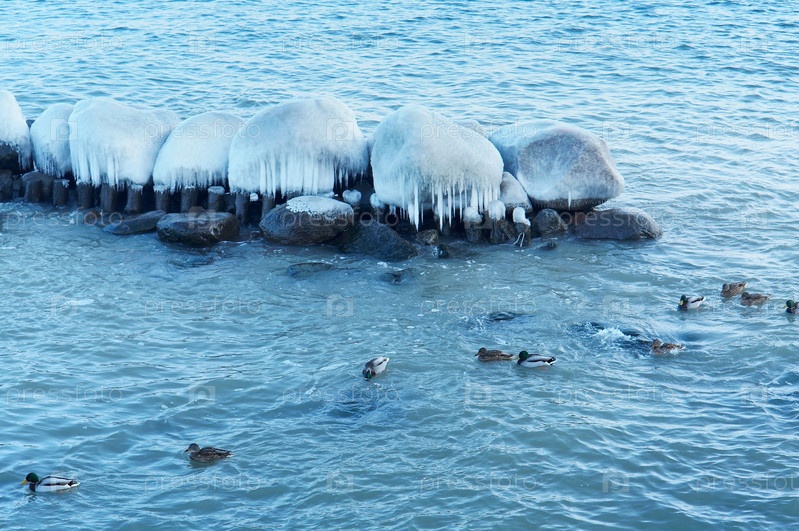 Море замерзло, вонзается в лед, морское побережье во льду, зима на Балтийском море, наледь на набережной