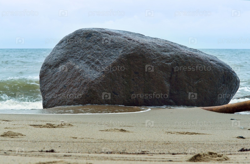 Огромный валун на берегу пруда, один большой камень в песке