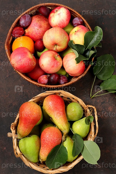 Яблоки, груши и сливы в корзинах на солнечном деревянном столе, фон благодарения, деревенский урожай, концепция здоровой натуральной пищи, детокс-диета и очищение организма, баннер на экране, кафе, ресторан, выборочный фокус