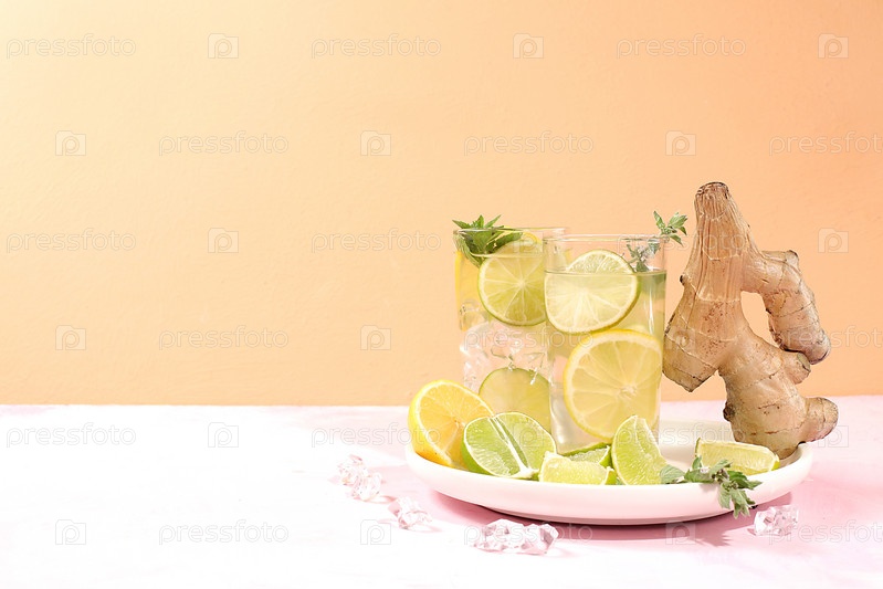 Детокс-напиток с лимоном, мятой, лаймом, имбирем и апельсином на светлом столе, коктейль улучшает обмен веществ и способствует снижению веса, минимальная концепция здорового образа жизни,