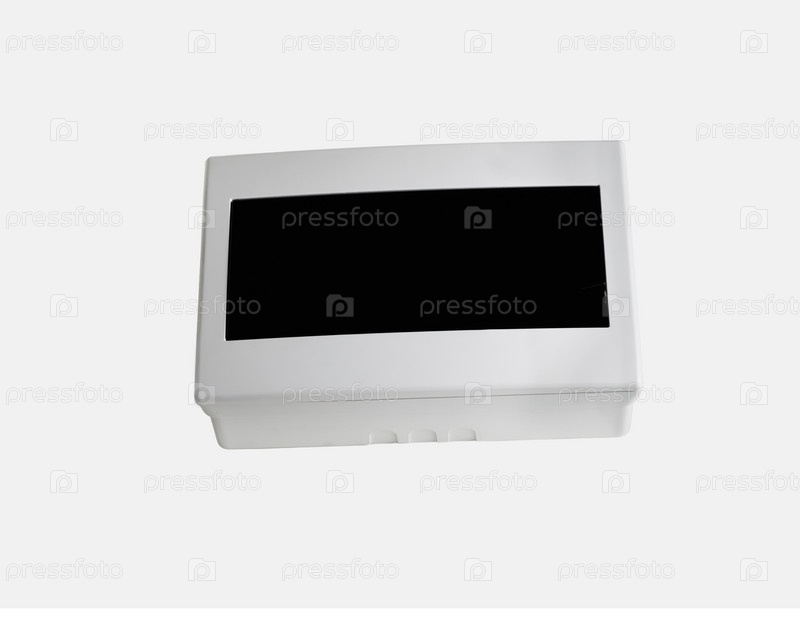 Пластиковый распределительный щит. Электрощит. Крупный план. Изолированные на светло-сером фоне