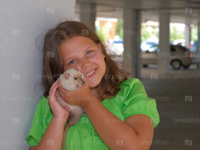 Красивая девочка с милой улыбкой держит в руках белую ручную крысу