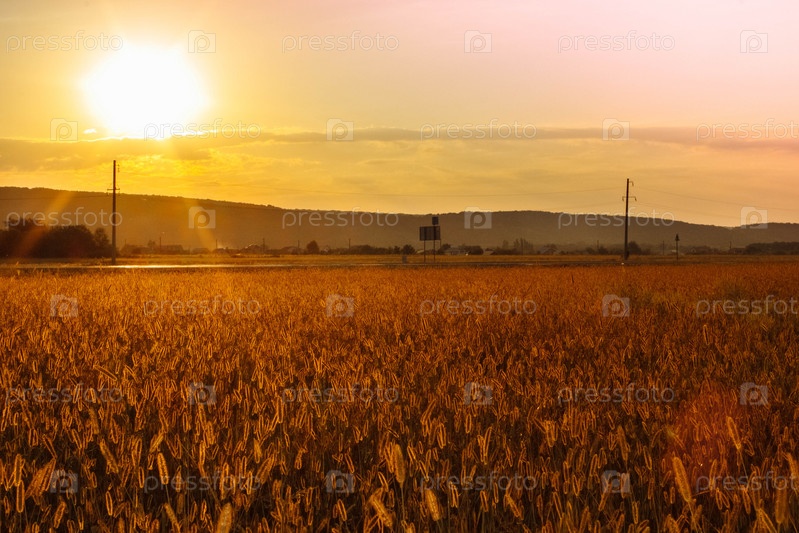 Пейзаж заката с полем травы, с дорожкой яркого солнца и солнечного света с домами розового неба и горами