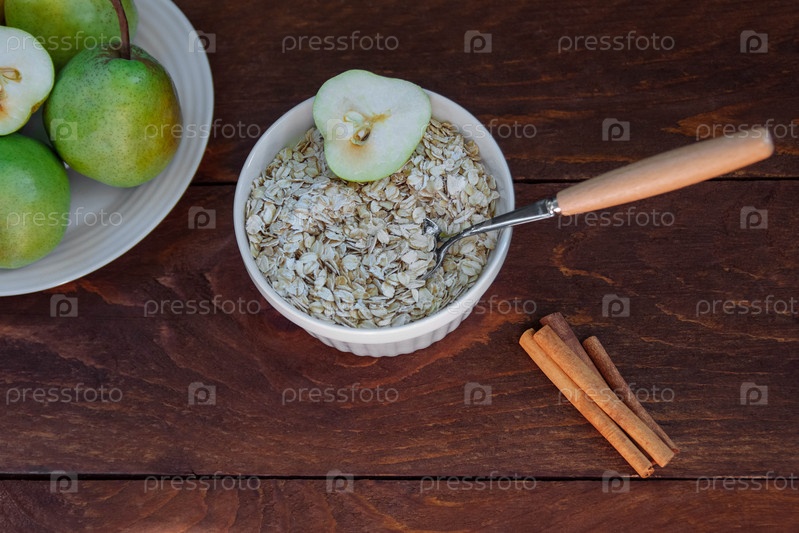 Сырая овсянка в белой миске с ложкой и нарезанной грушей и палочками корицы на коричневом деревянном фоне вид сверху, концепция здорового завтрака, приготовление десерта, диета и вегетарианский обед