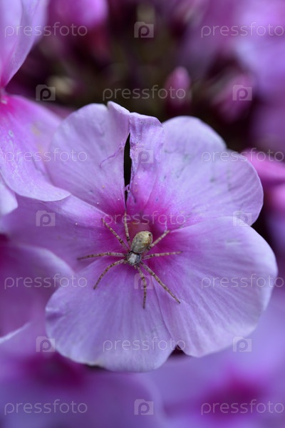 Паук на цветках флоксов в летнем саду. Полемониевые