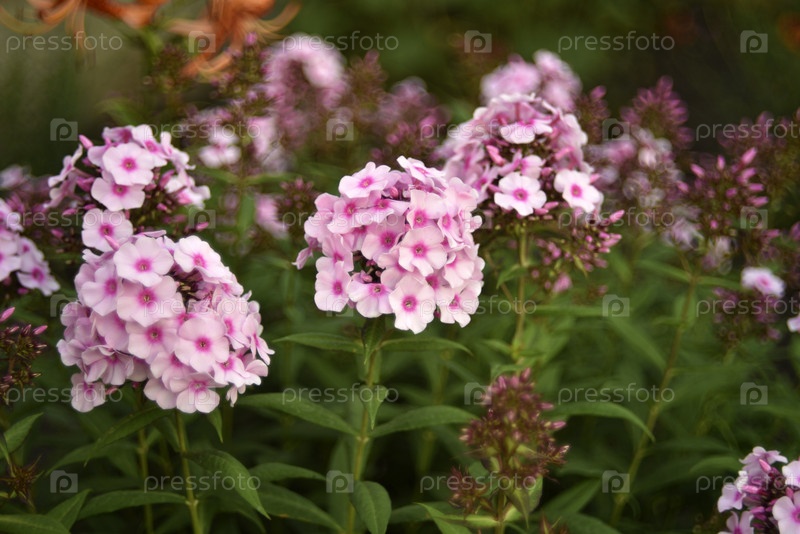 Светло-розовые цветки флокса в летнем саду. Полемониевые