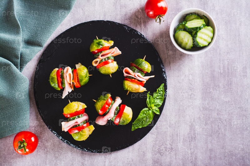 Брюссельская капуста, помидоры, огурцы и бекон на грифельной доске, вид сверху