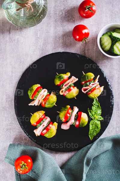 Аппетитные ползунки с овощами и ветчиной на грифельной доске сверху и вертикальный вид