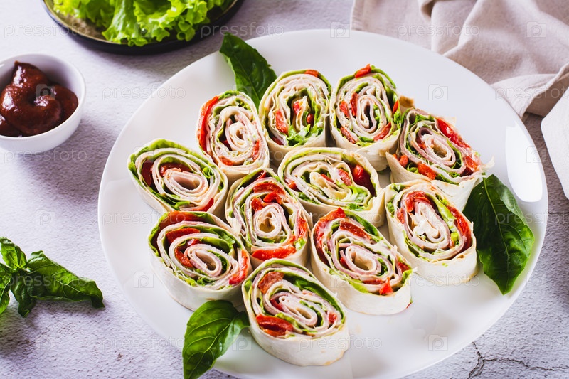 Свернутые бутерброды с листьями салата, беконом и печеным перцем в лепешке на тарелке