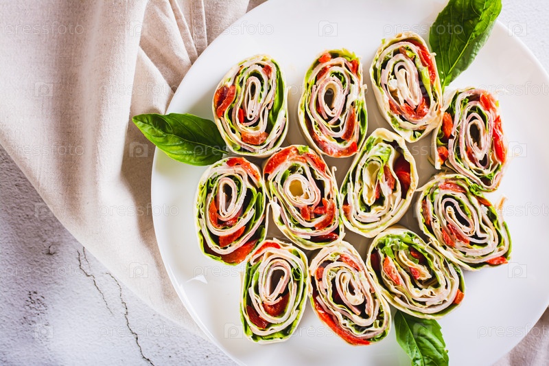 Крупный план бутербродов с салатом, ветчиной и запеченным перцем в лаваше на тарелке сверху