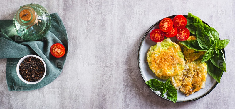 Стейки из запеченной капусты, свежие помидоры и базилик на тарелке, вид сверху, веб-баннер