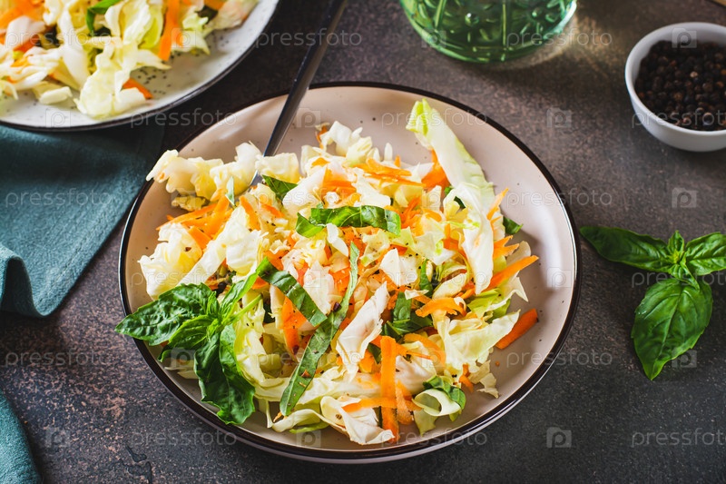 Салат из капусты со свежей капустой, морковью и базиликом на тарелке