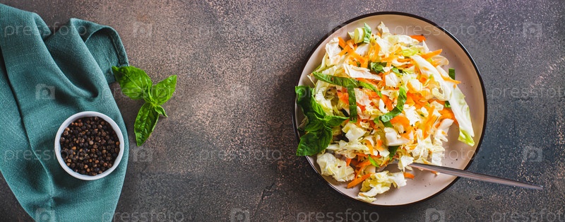 Салат из капусты со свежей капустой, морковью и базиликом на тарелке, вид сверху, веб-баннер