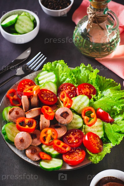 Салат из жареных сосисок, помидоров, огурцов и салата на тарелке по вертикали