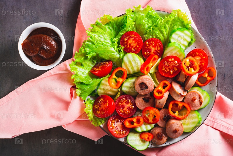 Крупный план жареных нарезанных сосисок с овощами и салатом на тарелке сверху