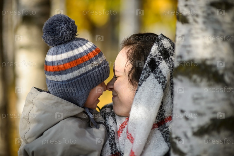Счастливая молодая мать с маленьким сыном на руках в осеннем парке - крупный план